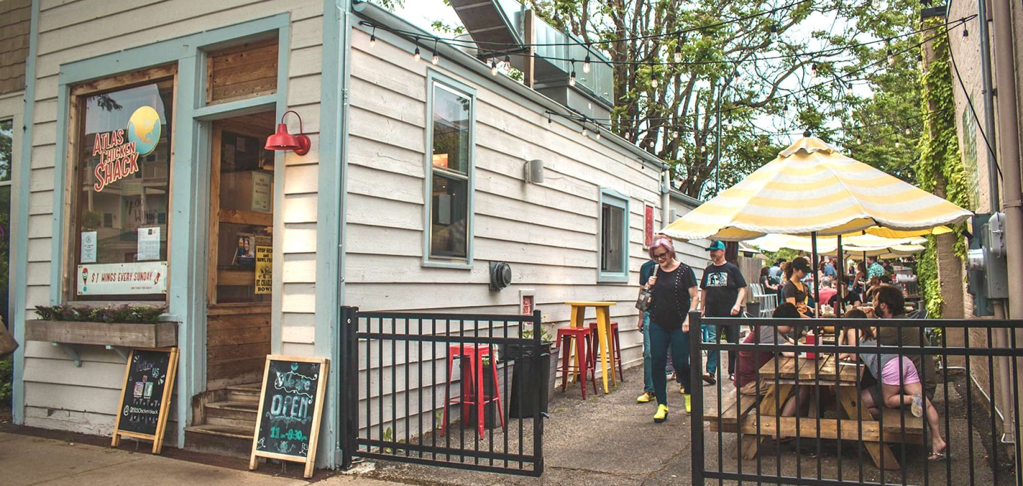 Atlas Chicken Shack is a downtown Geneva walk-up spot serving scratch-made, hormone- and antibiotic-free chicken sandwiches, tenders, and bowls with creative sauces and comfort-food sides on a lively patio just off 3rd Street.