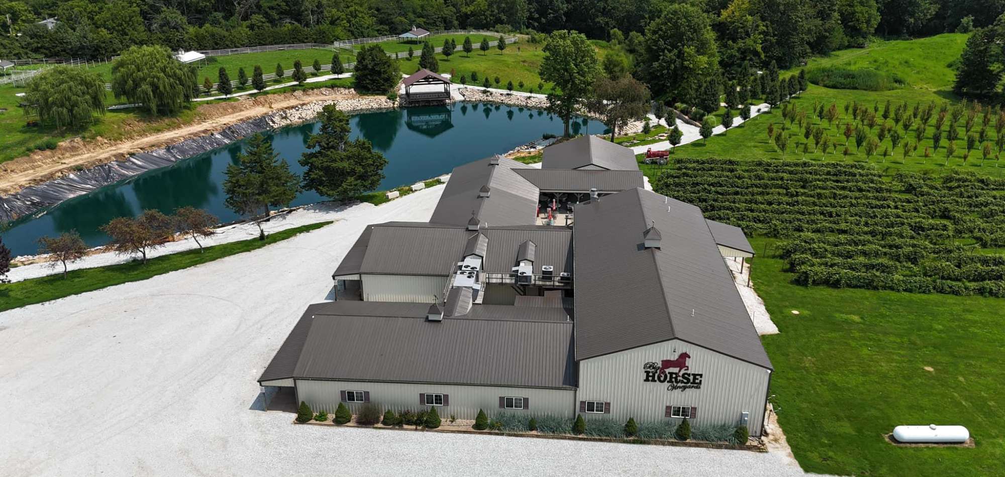 Big Horse Vineyards is sure to be a favorite destination for their guests. They offer you a chance to enjoy a great day in a scenic country setting. You will be able to enjoy some great wines while taking in the scenery of their spacious patio overlooking the vineyard, lake and the Horse Park. You can take a stroll through their Horse Park to see some pretty amazing and majestic Draft Horses along with a variety of other animals.