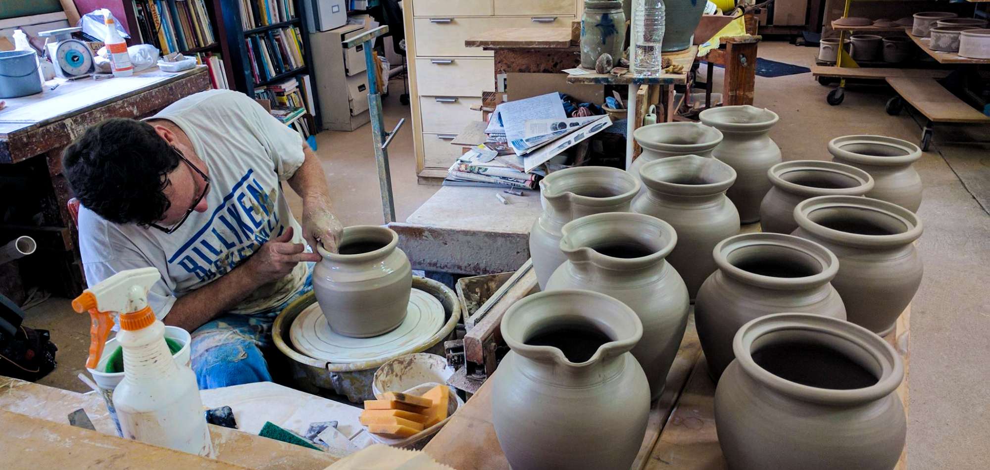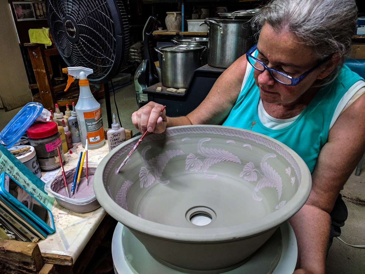 The result of a couple's dream to make a living together in the world of fine craft by combining their skill sets - a love of hand-throwing pots and firing monstrous kilns and a passion for painting, slip-trailing, sgraffito-carving and sculpting.