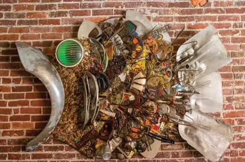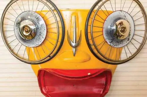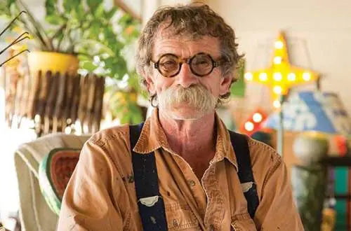 Thirty years ago, Meadows repurposed his architectural and carpentry knowledge earned working in Midwest cities into becoming a self-taught artist creating whimsical works composed of discarded everyday objects. He scavenges materials along river banks, digs through the local dump and drives country roads, hauling his finds in a psychedelic painted van. Old lumber, rusty machinery, bins of silverware and piles of dented pans fill his warehouse, which smells of sawdust and paint. Meadows points out, “There is nothing here of value, but I create from it because I see all kinds of possibilities.”