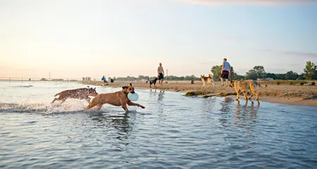 Chicago’s nearby Lincoln Park features Wiggly Field Dog Park and walking paths throughout the area that offer scenic views in spots like the Nature Boardwalk. More trails throughout the city to take your pup include the Chicago Lakefront Trail (several locations in Chicago) and the 606 Trail that starts in the Bucktown area.