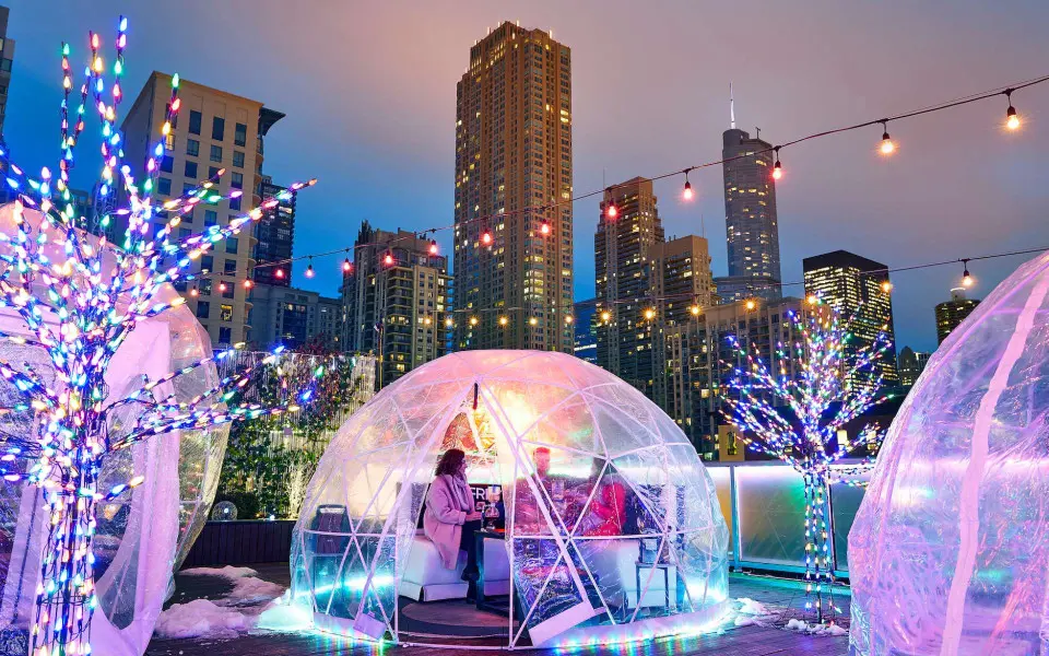 Transport yourself to the golden age of art deco at Upstairs at The Gwen. This chic escape above The Gwen Hotel mixes modern accents with classic style, as well as 360-degree views of the city and seasonal touches such as fire pits and a curling rink. It’s the perfect place for a glamorous night out in the heart of downtown Chicago.