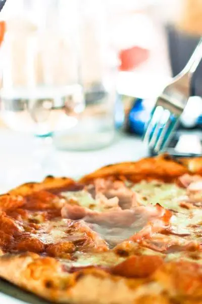 Person eating pizza with a knife and fork