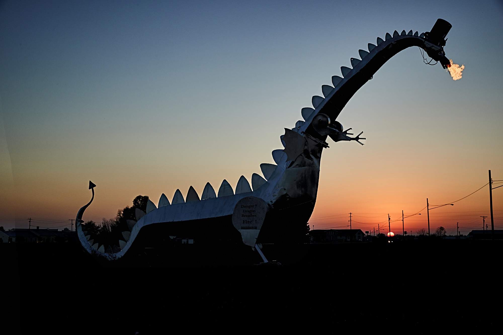 There are a lot of roadside statues and sculptures in Illinois. The Kaskaskia Dragon might be the only one that comes to life. Buy a “dragon coin” from the liquor store across the road, drop it in the coin-box and this 35-foot tall metal dragon starts breathing fire, eyes glowing red. It’ll keep going for 10 minutes—perfect time to get your photos and selfies.